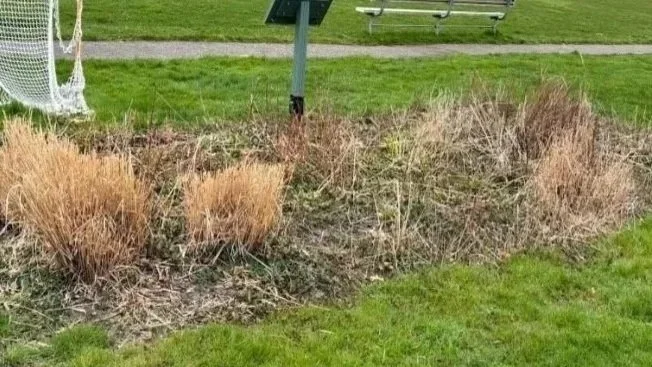 Starting in 2024: We stopped mowing in early spring, and instead we cut plants to 12-18” height in order to preserve overwintered stems until the hibernating insects and other wildlife emerged.In early June, as plants grew rapidly, we did a “Chelsea Chop” which keeps plants from becoming too tall and allows fuller flowering. Only newly planted plugs are watered; the rest of the plantings thrive with only rainwater. Every two weeks, garden club members weed out invasive plants, and mulch with straw as needed. Flowers are visited by pollinators, and left to make seeds which feed birds over the winter. Stems remain as important refuges for overwintering insects.